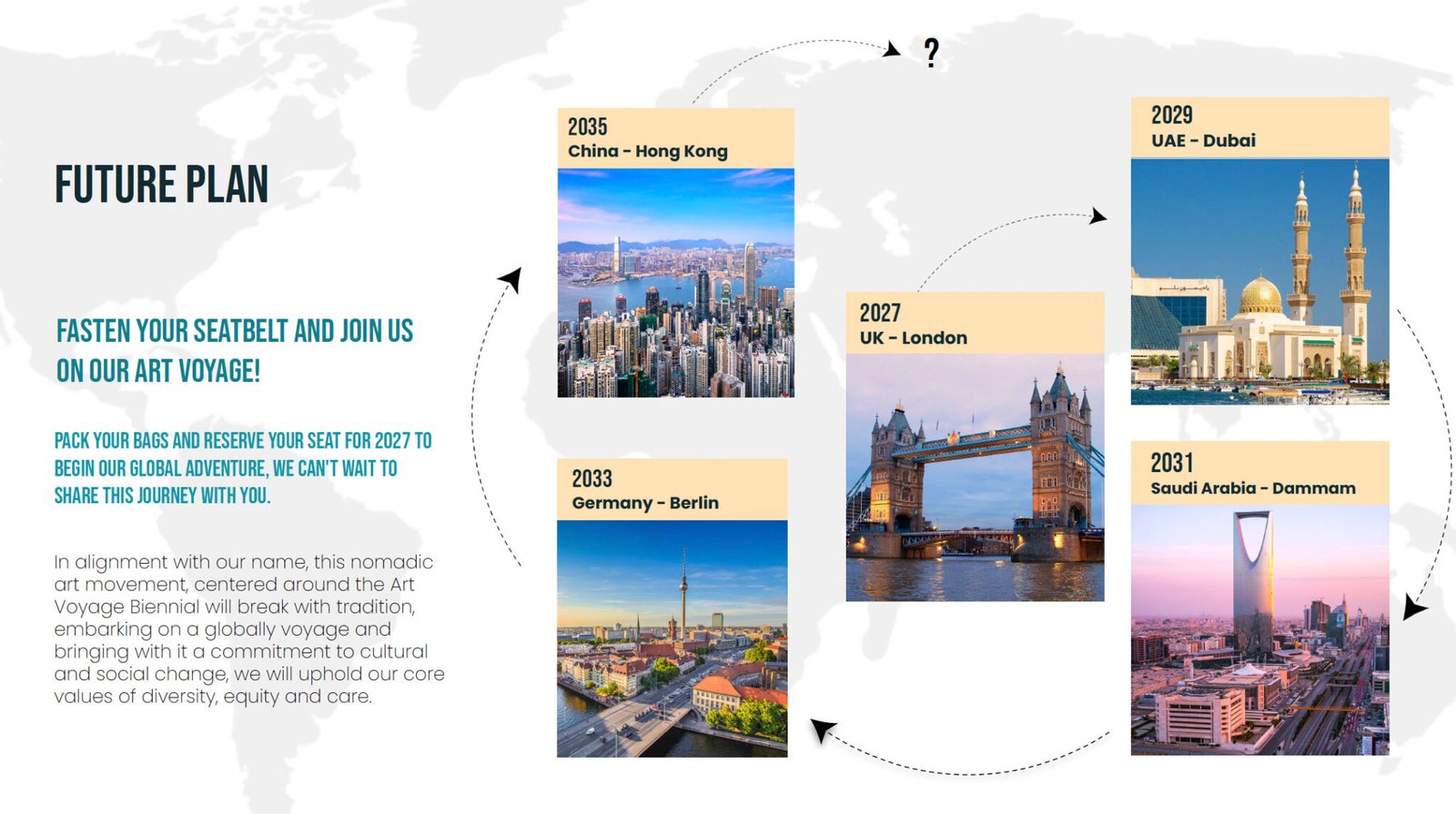 As the Art Voyage Biennial continues to grow, we are excited to expand our presence across continents—bringing together diverse cultures, artists, and communities. Our future plans include hosting editions in vibrant cities known for their cultural heritage and emerging creative scenes. From London to Sharjah, Berlin to Hong Kong, and beyond, each location will offer unique dialogues between global and local artistic voices. These future editions aim to nurture creative exchange, support new talent, and continue our mission of making contemporary art accessible, inclusive, and impactful.