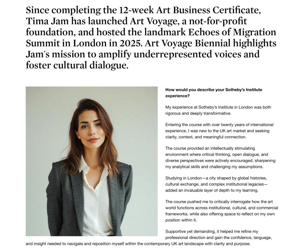 Sotheby’s Institute of Art featured an article titled “Meet the Alumna Championing Cross‑Cultural Artistic Exchange,” spotlighting Tima Jam and her trajectory from completing the 12‑week Art Business Certificate to founding Art Voyage and hosting the Echoes of Migration Summit in London in 2025. The article reflects on how the course shaped Tima’s critical understanding of the art world and supported her work in building platforms that amplify underrepresented voices and foster cultural dialogue.