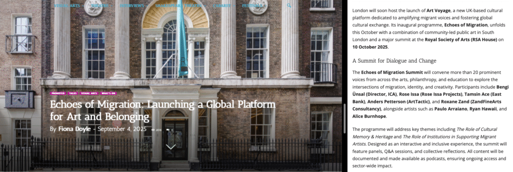 The Artiscape Gallery recently published a feature titled “Echoes of Migration: Launching a Global Platform for Art and Belonging,” spotlighting the launch of Art Voyage.